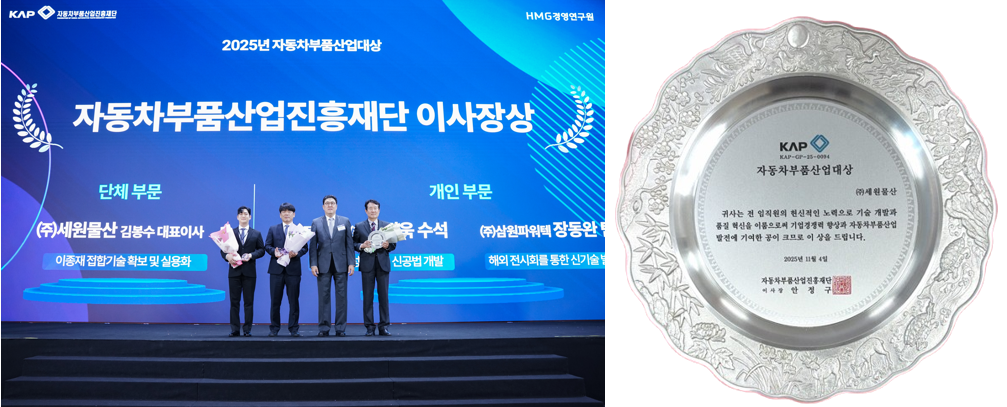 | "세원물산, 2025 자동차부품산업대상 단체부문 재단 이사장상 수상 " | |