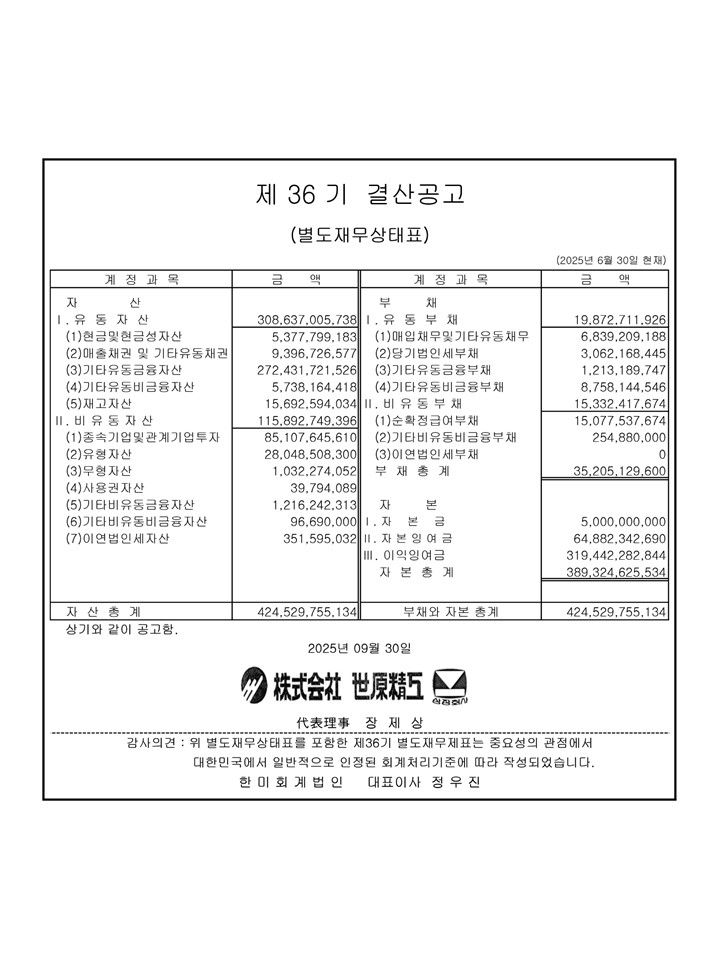 (주)세원정공 제 36기 주주총회 결산공고_별도