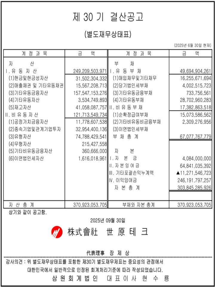 (주)세원테크 제30기 정기주주총회 소집 공고
